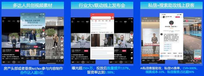 针对房产行业营销痛点以及消费习惯变化,巨量引擎整合平台资源及营销产品工具,帮助房企成功搭建完整的品牌营销及线索经营路径,让所处不同阶段、面向不同区域的房企都能找到更高效的获客模式,进而推动行业稳步前进。