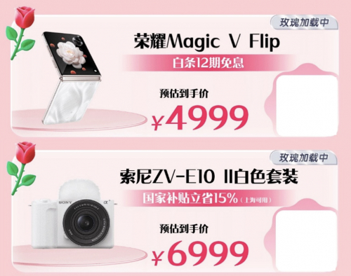 春天是捕捉美好瞬间的季节,无论是拍照还是录视频,一部得心应手的设备能让生活更加丰富多彩。荣耀Magic V Flip手机,凭借小巧精致的外观和单反级的拍照实力,能轻松记录生活中的每一个精彩瞬间。4.0英寸的大外屏设计,查看消息、接打电话和拍照变得更加便捷,京东预估到手价4999元,还可享12期免息。索尼ZV-E10二代微单白色套装,自带10种创意外观滤镜,无论是照片还是视频,都能轻松拍出大片质感,京东预估到手价6999元。