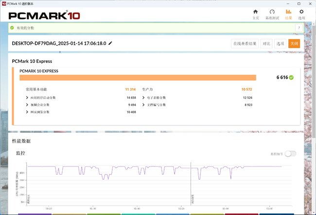 再跑一下PCMark,最后得分6616。按照官方的分数解析,对于典型办公室工作和轻媒体内容建议达到4500,这个得分远远超过了标准,可以轻松完成办公和媒体编辑的需求。