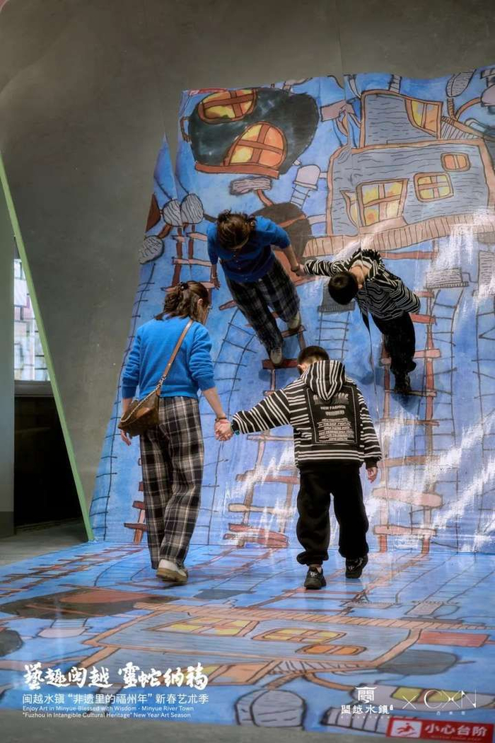 如果说非遗是闽越水镇的灵魂,艺术创新则是其激活文化生命力的密钥。此次新春艺术季中,新开辟出了“艺术岛”及MIN艺术中心、YUE艺术中心,央美领衔的三大艺术展览分散在两大艺术中心之内,在为新春艺术季赋予浓厚的艺术底色的同时,更是构建了一个以专业力量引导的、以“非遗”“少儿美育”为核心内容的综合展示与传播的平台。