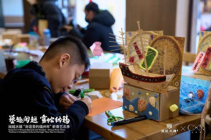 如果说三大展览是闽越水镇新春艺术季的第一重艺术底色,那国内知名美育品牌“涂思美育”和“乐诗童”针对闽越文化的特色开发出的11项非遗亲子美育课程,就是第二重艺术底色。课程内容“福船”到中国十大传世名画之首——《清明上河图》,再到非遗香囊、非遗养生锤、闽南龙虎灯、非遗甲马版画……堪称一场内容多元化、体验丰富化、功能立体化的重磅级美育盛宴。