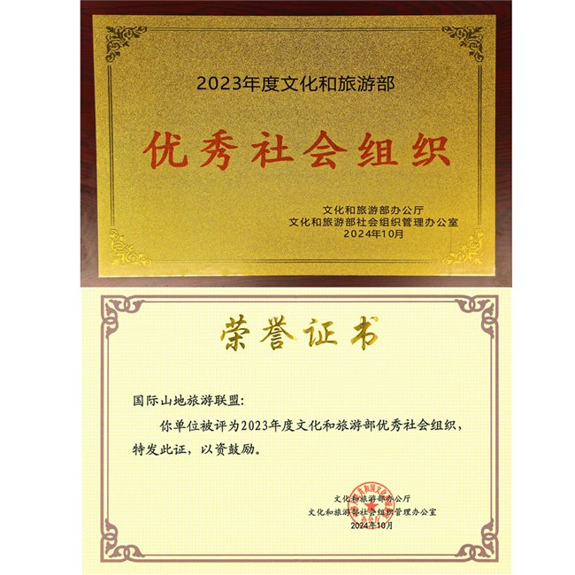 为进一步推动社团组织规范化建设,选树一批表现优异的社团组织,2024年,文旅部对所管理的社团组织开展了述职评议考核,考核以现场评议考核结果为基础,结合上一年度年检结论、评优评估及日常监管情况,在131家社团组织中评出优秀、较好、一般、较差四个档次,国际山地旅游联盟从众多参评单位中脱颖而出,荣获“优秀”荣誉称号,在10月11日文化和旅游部社会组织培训会上,文旅部领导向联盟领导颁发了“荣誉证书”。联盟自成立以来,在发起方贵州省全力支持和文旅部、民政部的指导帮助下,始终不忘初心,牢记使命,充分发挥专业优势和会员力量,积极投身和推动山地旅游治理体系创新构建,着力创建业界交流合作平台,推广国际山旅成功经验,促进山地经济和民生福祉共享。在融入国家战略,构建国际合作机制,创新发展模式,讲好中国和世界“文明互鉴”故事等方面开展了富有成效的探索实践,成为推动可持续旅游发展的有生力量。