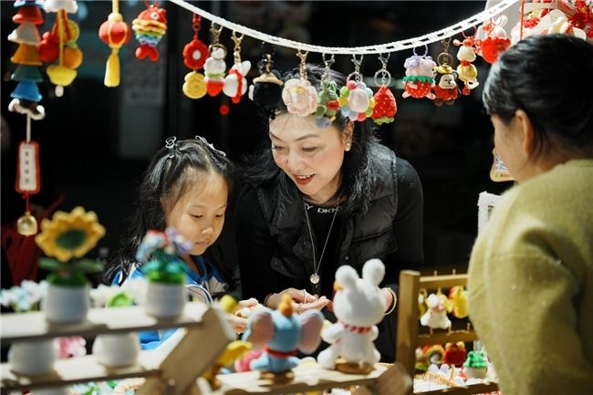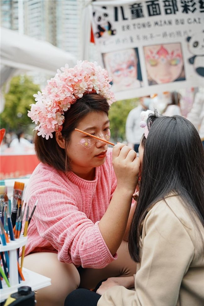 手作区内,非遗传承人现场教授扎灯笼技艺,孩子们在穿竹骨、糊彩纸的过程中感受传统工艺的魅力;脸绘师笔尖轻点,一朵朵花钿绽放在孩童额间,传统文化以生动形式浸润童心。