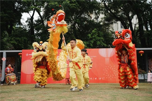 锣鼓喧天中,一金一红两头彩狮昂首入场,绒球般的脑袋灵活转动,引得人群爆出喝彩。十余名壮汉擎着一条金龙随鼓点疾走,龙首时而冲天盘旋,时而贴地游弋……在雨后放晴的上步绿廊公园,新春元宵的欢腾气息扑面而来。
