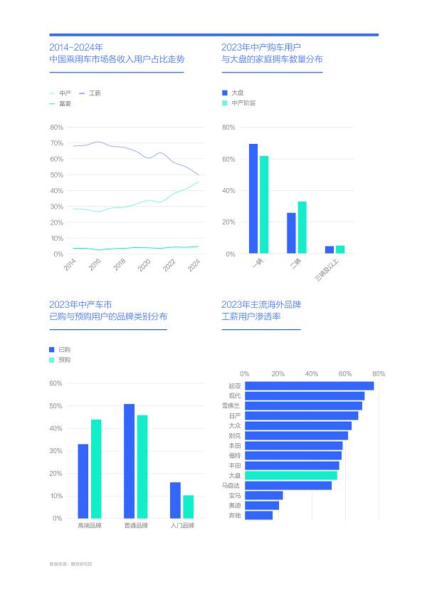 对比工薪,中产用户有自己鲜明的购车特征:中产的家庭拥车数由一辆车向两辆及以上的多车时代挺进,不仅要解决老公的用车需求,还要解决老婆的用车需求,甚至是孩子或老人等;中产家庭选购高端品牌的意愿更强烈,2023年中产已购车型的高端品牌占比突破30%,预购占比逼近45%;