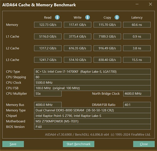 AIDA64内存基准之测中,墨云藏境系列于8000 MT/s高频之下,读取、写入、拷贝分数依次为122.73 GB/s、117.41 GB/s与115.7 GB/s,延迟仅60.6 ns。测试结果,充分彰显其作为旗舰内存之性能魅力,带宽性能极为出众。