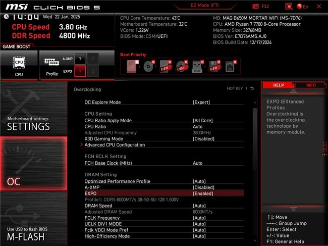 为验墨云藏境系列之兼容性表现,遂加入AMD平台对其进行测试,硬件配置为R7 7700+微星B650M MORTAR WIFI主板,余之硬件与Intel平台一致。其在BIOS中开启EXPO一键超频预设,亦同样可达8000 MT/s之高频与CL38之低延时序。