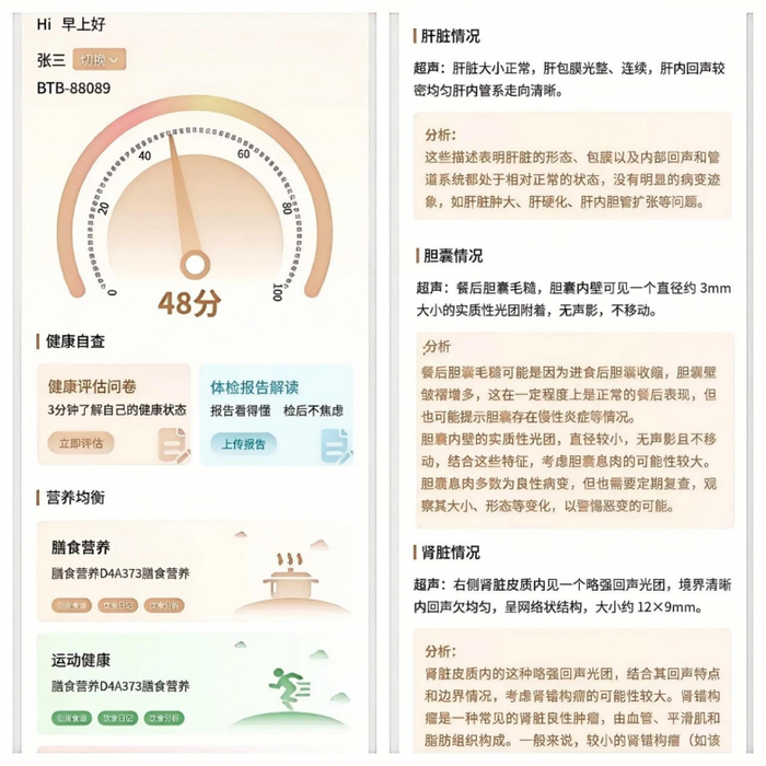 如:用户只需简单上传体检报告和检验单据,即可通过DeepSeek模型启动深度健康分析。该模型基于极为复杂的深度学习算法,融合海量医学大数据资源,结合了CNN(卷积神经网络)的图像精准识别技术与RNN(循环神经网络)的序列数据处理能力,能够在极短时间内精确解析血液生化指标、医学影像细节等关键健康数据。