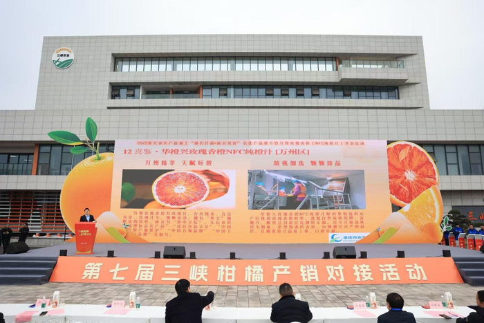 在重庆市农产品加工“渝农佳品·新春见喜”名优品牌推介首发仪式暨万州玫瑰香橙佳品(NFC果汁)共鉴活动中,由重庆市农业农村委员会农产品加工处处长张新主持,向现场嘉宾展示了一系列优质农产品品牌,并重点推介了万州玫瑰香橙佳品——华橙兴玫瑰香橙NFC纯橙汁。