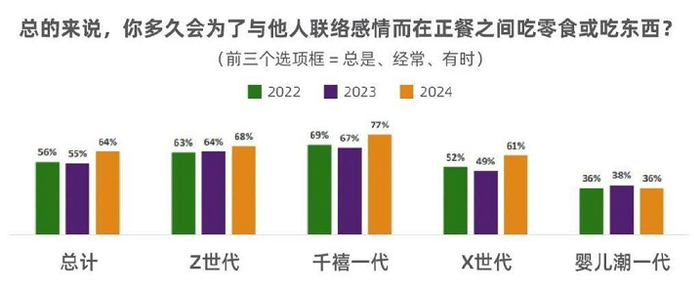随着人们物质生活水平的不断提升,零食的消费场景从正餐之外的补充,延伸到了多个生活场景之中。亿滋国际发布的《2024年全球零食现状报告》显示,全球约三分之二(64%)的消费者表示,他们会出于社交需求食用零食,这一比例较去年上升了6%。在千禧一代,这种趋势越发明显。