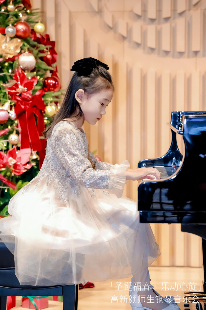 高新颜老师从事钢琴教育教学25年,目前任教于中央音乐学院继续教育学院,担任英国李斯特学会理事、WPTA世界钢琴教师联盟荣誉专家会员、中国音乐家协会电子键盘学会会员、北京音乐家协会钢琴基础教育分会会员。恰巧近期,笔者也有幸观看了12月23日在北京柏斯金源旗舰店音乐厅举行长江钢琴遇见·名家系列——《圣诞福音·乐动心旋》高新颜师生钢琴音乐会成功举行,此次音乐会也是高新颜老师全球巡演的第四站。音乐会由四位小钢琴家带来精彩的演奏,他们分别是来自香港沪江维多利亚小学2年级的蔡欣哲,她演奏了两首德国作曲家拜厄的练习曲,之后与高新颜老师演奏了一首圣诞主题四手联弹《红鼻子驯鹿鲁道夫》。蔡欣哲同学出场优雅端庄,得益于平时多次的舞台戏剧学习,演奏过程中,身体顺应着乐句线条律动,将美妙的旋律传递给观众。