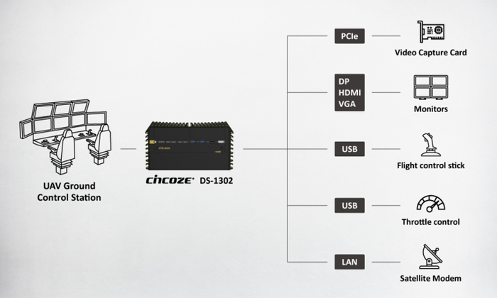 现代军事作战日益依赖无人机执行情报收集、监视、侦察及打击任务,而无人机地面控制站(GCS, Ground Control Station)则是指挥与控制体系的核心,确保无人机精准操控并快速执行任务。Cincoze 的客戶为南亚国家大型国防系统整合商,专注于空中、陆地、海上及核生化防御系统的研发与整合。本次专案采用 DS-1302 强固型嵌入式工控机作为无人机地面控制站的核心,凭借其高性能处理能力与丰富扩展性,打造「虚拟驾驶舱」,让操作员能精准指挥并即时监控无人机状态,确保任务顺利执行。