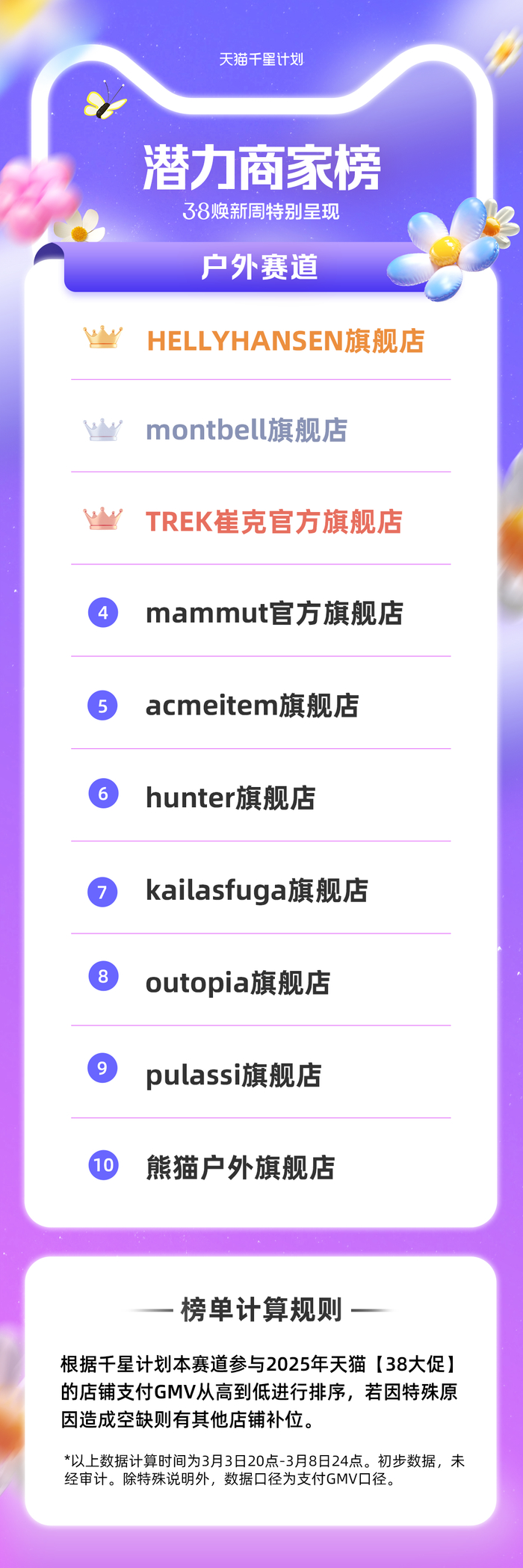 除了38焕新周,天猫千星计划还持续按季度发布「潜力商家榜」,挖掘和助力天猫各赛道的新锐商家。第一季度打榜赛接近尾声,达成目标的商家可获得1万元打卡激励,各赛道排名前10%的商家单季度最高可获得8万元经营激励金。