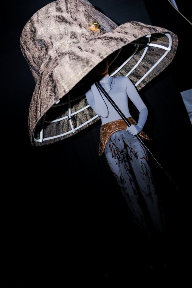 大地色羊毛呢与靛蓝扎染棉布层叠,衣襟刺绣灵隐寺瓦当纹样,每一针皆用拆迁废料熔制的金属丝绣成。压轴造型是一顶三米长的斗篷帽,拓印杭州百年民居砖墙肌理,行走时,砖墙肌理随步伐流淌,化作一幅《千里江山图》的当代注脚。“家”的温度,也被解构为可穿戴、可拆解的文化基因库。