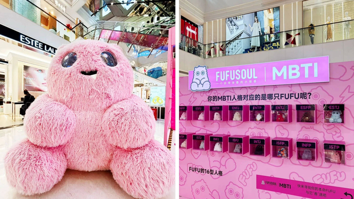 西安王府井百货(永宁门店)引入FUFUSOUL西安首展空间,以憨态萌样的毛绒IP打造巨型玩偶吸引顾客打卡,现场更有多种MBTI性格专属香氛玩偶供消费者选购。这类以满足情绪价值为导向的展陈空间越来越吸引年轻人的关注,也是带动沉浸式逛店、促进消费转化的有力尝试。