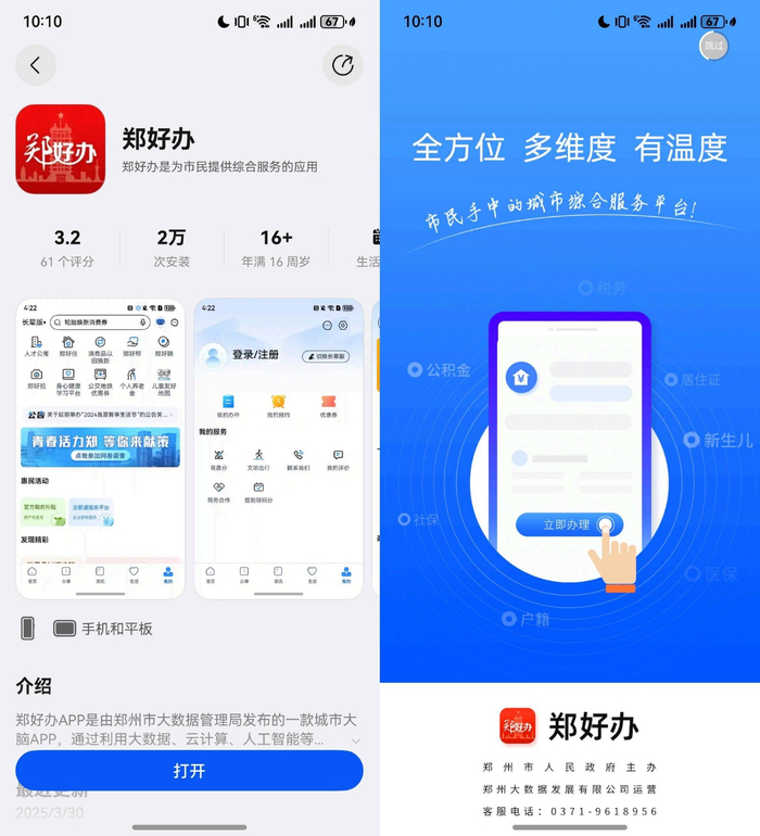 郑好办App是由郑州市人民政府主办、郑州市行政审批和政务信息管理局承办、郑州数智科技集团及郑州大数据发展有限公司运营的一款城市综合服务平台,通过利用大数据、云计算、人工智能等前沿技术为郑州市民提供一体化、个性化、精准化的“掌上办”政务民生服务——医保、社保、公积金、住房、税务、数字身份、人才补贴、水电气等服务一个App轻松全掌握。