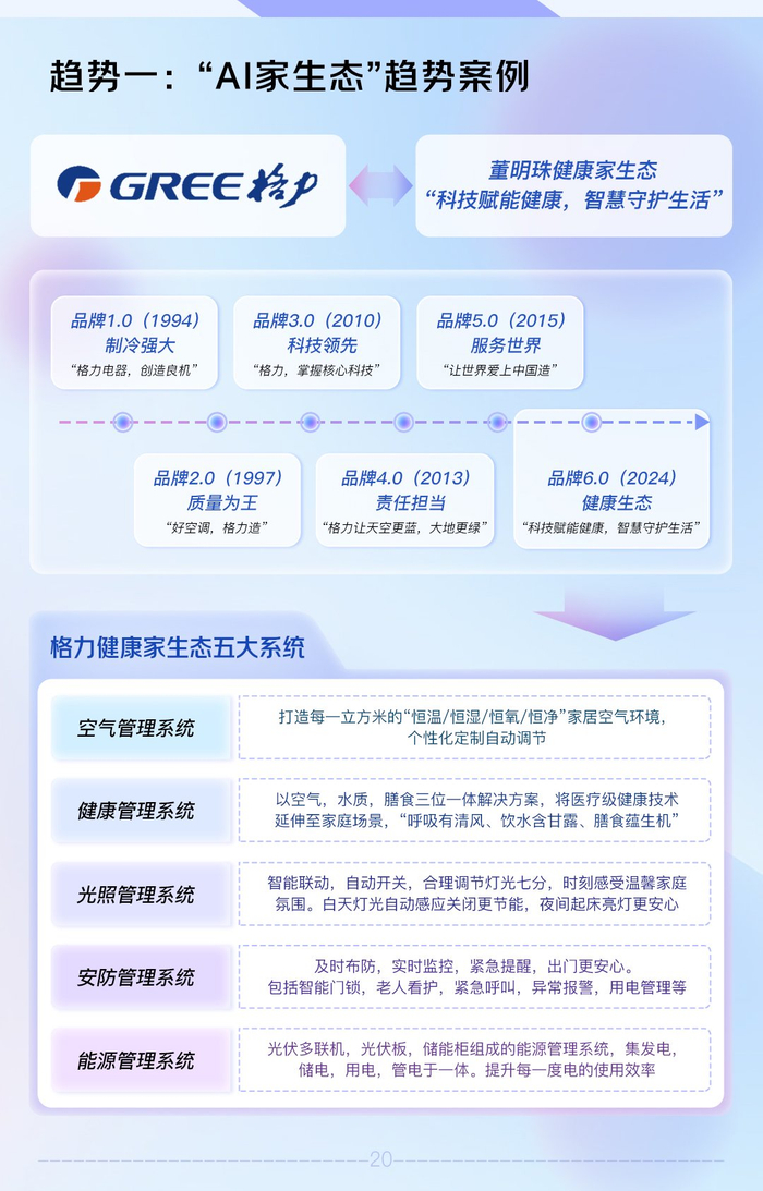 白皮书首次提出六大趋势赛道:AI家生态、健康守护、绿色科技、极致净界、性能卷王、空间美学。从功能到生态,从消费到责任,从产品到理念,预示着人类生活方式的变革,也是家电行业从“满足需求”向“创造美好生活”的价值跃迁。随着科技的进步,未来的家电将成为连接物理世界与数字生活的超级接口,重新定义"家"的温度与智慧。