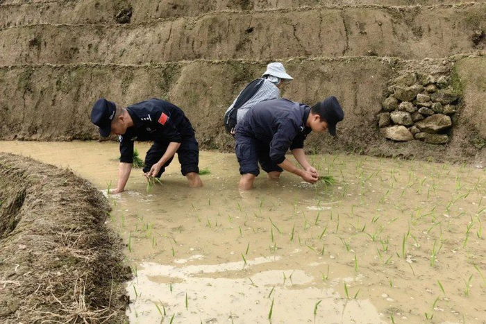 分站民警、联防所同志与村民们一同下田插秧
