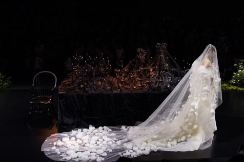 白色婚纱的纯洁与女孩们的叛逆碰撞被展现得淋漓尽致,仿佛在讲述着每一个少女在成长过程中对规则与自由的思考。设计师通过精妙的细节处理,将传统与反叛、柔美与力量完美融合。蕾丝与硬纱的碰撞、古典廓形与现代剪裁的交织,无不彰显着当代女孩们在传统与现代之间的自我探索。
