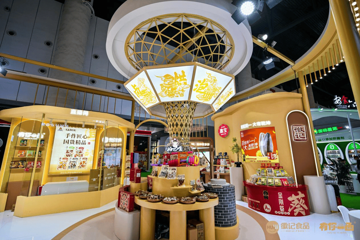 徽记食品和有你一面的展台以“非遗传承,国货精品”为主题,将传统文化与现代设计完美融合,吸引了众多参观者的目光。展台整体设计分为两个区域,分别展现了徽记食品和有你一面的品牌特色。